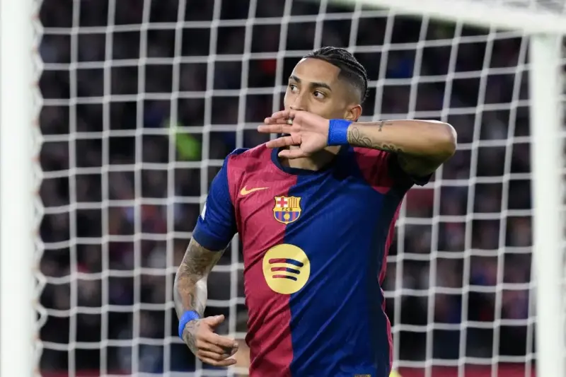 O camisa 11 recebeu assistência de Lamine Yamal para inaugurar o marcador. Depois, foi sua vez de servir o jovem espanhol, que buscou um cruzamento fora da área de Raphinha e marcou um golaço.