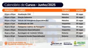 Seguindo o cronograma da Eptran, no dia 9 de junho, iniciam os cursos de Direção Defensiva (30 vagas), Especialização para Condutor de Transporte de Veículo de Emergência (25 vagas), todos também pelo turno matutino, além de outro curso de Atualização de CNH (50 vagas), no período vespertino.