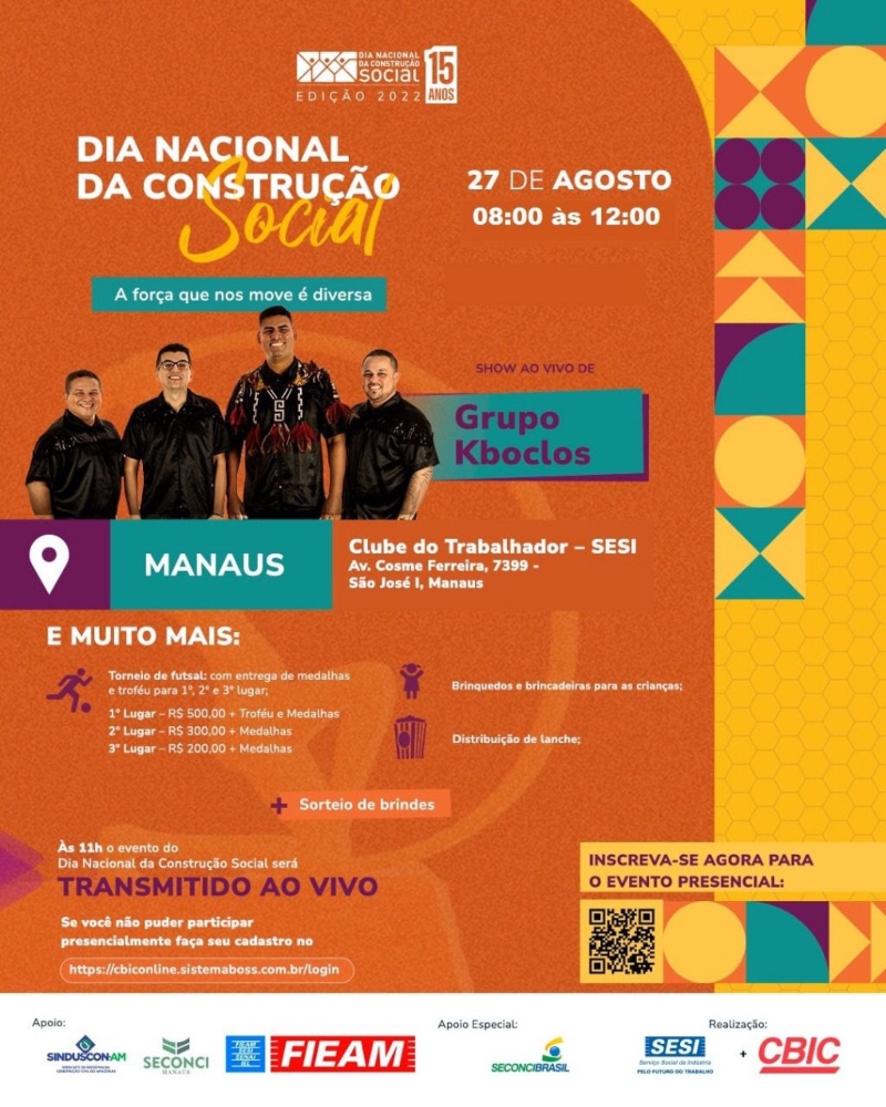 O Dia Nacional da Construção Social será no próximo dia 27 de agosto, de 8h às 12h no Clube do Trabalhador do Sesi, localizado na Avenida Cosme Ferreira, 7399 – São José 1. A inscrições estão abertas para todos os trabalhadores das empresas associadas ao Seconci Manaus e Sinduscon Amazonas.