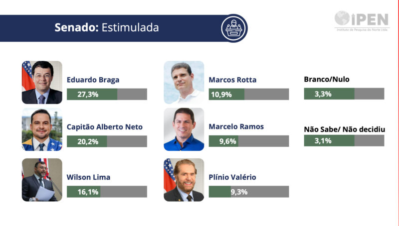 No cenário estimulado, o senador Eduardo Braga (MDB) aparece na liderança com 29,1% dos votos válidos, seguido pelo deputado federal Capitão Alberto Neto (PL), com 21,8%, e pelo governador Wilson Lima (União Brasil), que soma 17,2%.