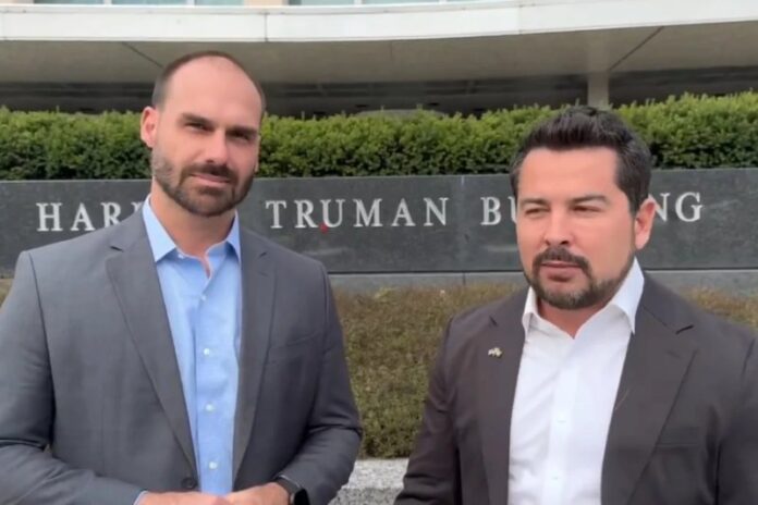 Um dia antes da reunião de negociação entre Estados Unidos e Brasil sobre a questão do tarifaço e das sanções impostas a autoridades brasileiras, o deputado federal Eduardo Bolsonaro (PL-SP) e o jornalista Paulo Figueiredo anunciaram que se reuniram com autoridades americanas no Departamento de Estado, em Washington, nesta quarta-feira (15/10). O órgão é comandado por Marco Rubio.