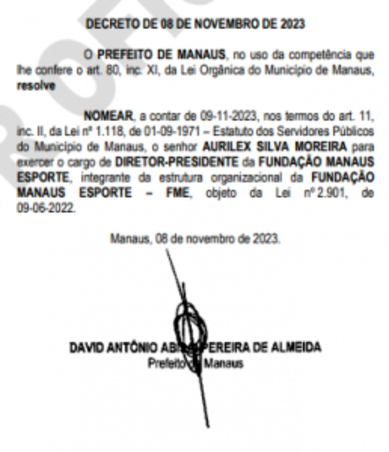 Quem assume a pasta é Aurilex Silva Moreira, que era o então vice-diretor da Fundação Manaus Esporte, homem de confiança de David Almeida.