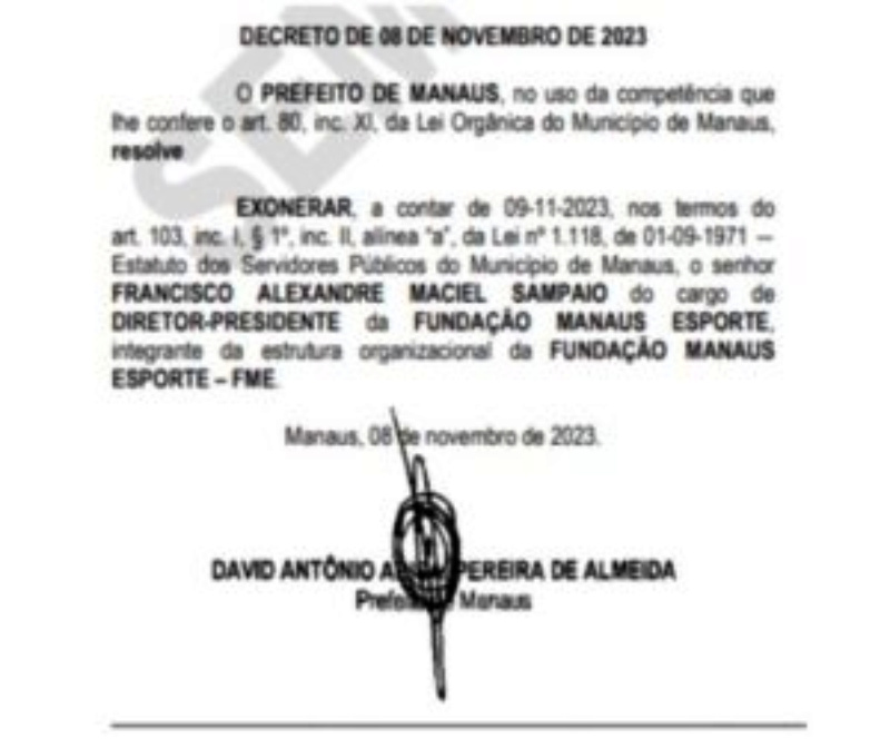 O diretor-presidente da Fundação Manaus Esporte, Francisco Alexandre Maciel Sampaio, membro da Igreja Universal do Reino de Deus, foi exonerado pelo prefeito David Almeida (Avante).