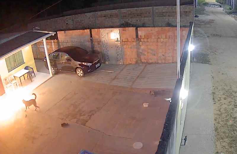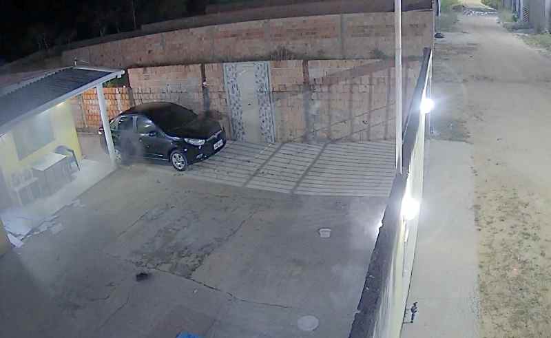 Imagem de uma câmera de segurança mostra quando por volta de 3h16, dois homens com os rostos cobertos, um com uma arma de fogo nas mãos passam em frente da casa. Um deles de bermuda azul, camisa vermelha e uma camisa amarela cobrindo o rosto entra em um terreno ao lado da residência nesse momento o cachorro começa desesperadamente a latir.