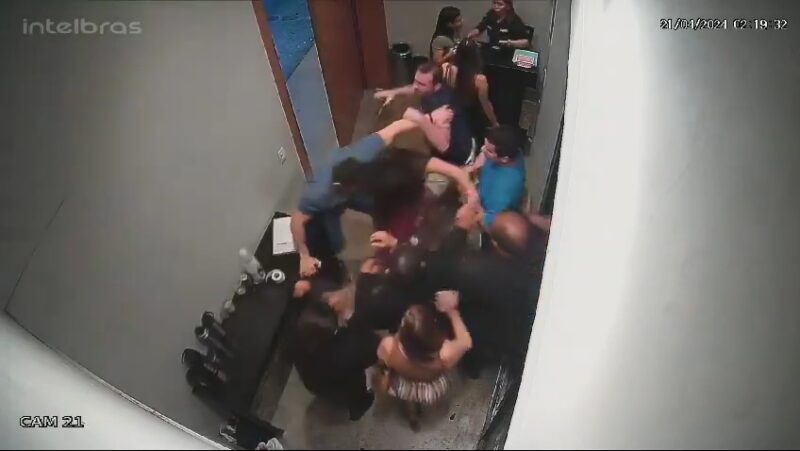 O vídeo também mostra que, após os disparos, o policial entrou novamente no estabelecimento, viu a mulher baleada, mas não prestou socorro e deixou o local sem mais interações.
