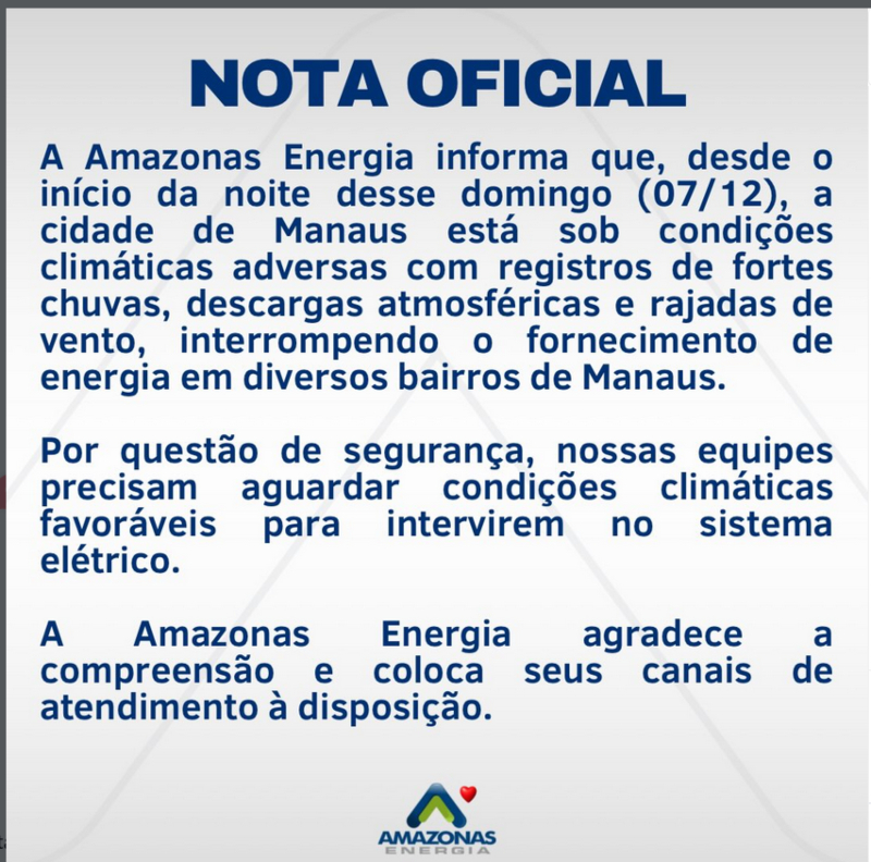 A Amazonas Energia, em nota oficial, informou que as equipes precisam aguardar condições climáticas seguras para iniciar reparos no sistema elétrico, e que o trabalho será retomado assim que possível.