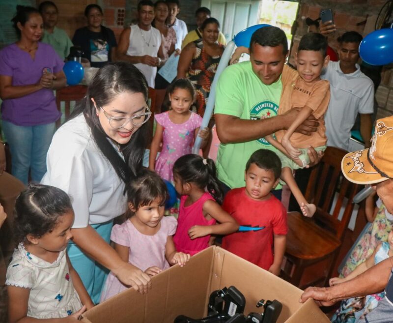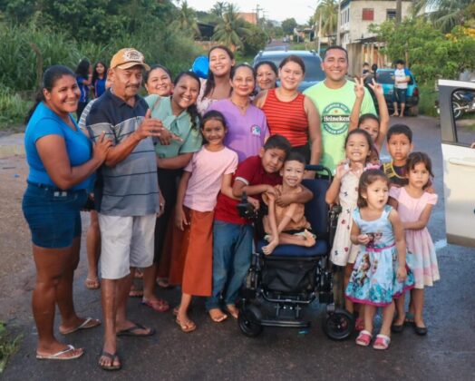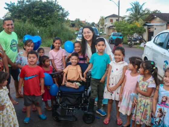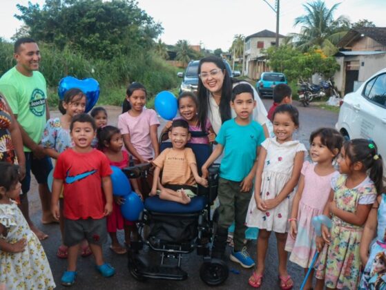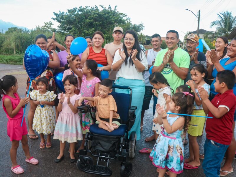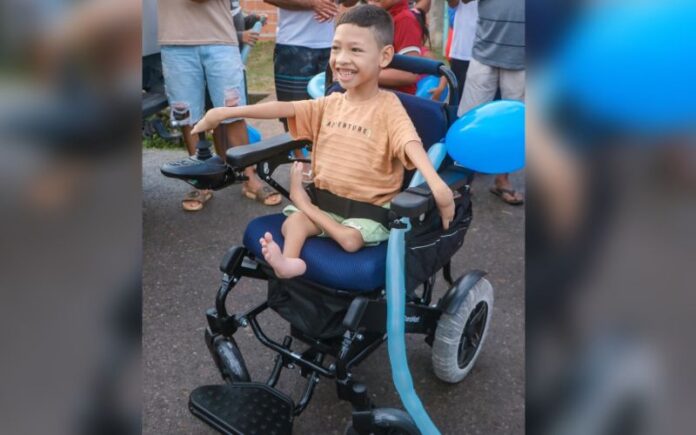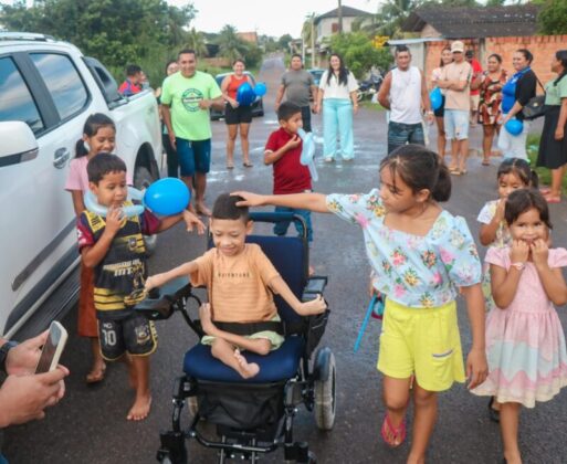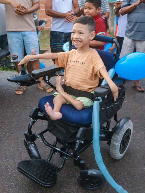 O pequeno Brayan Levy, de apenas 8 anos, emocionou a cidade de Maués nesta sexta-feira (16) ao receber das mãos da prefeita Macelly Veras uma cadeira de rodas motorizada. Diagnosticado com artrogripose múltipla congênita — condição rara que afeta a mobilidade das articulações —, Brayan viu seu maior sonho se tornar realidade: poder se locomover com autonomia e brincar ao lado das irmãs na principal avenida da cidade.