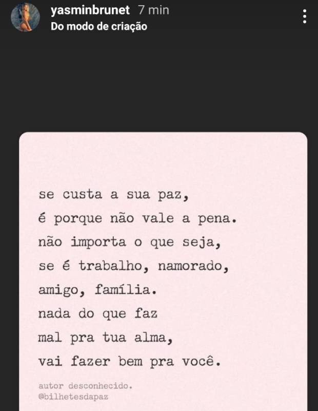 “Se custa a sua paz, é porque não vale a pena. Não importa o que seja, se é trabalho, namorado, amigo, família. Nada do que faz mal pra tua alma, vai fazer bem pra você”, estava escrito na publicação de Yasmin.