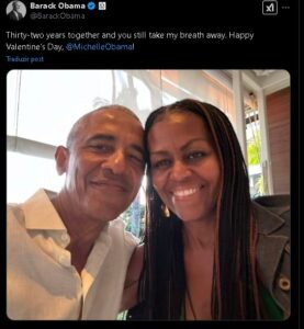 “Trinta e dois anos juntos e você ainda me tira o fôlego. Feliz Dia dos Namorados, Michelle Obama”, escreveu Obama.