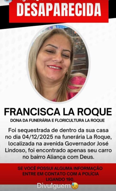 Amigos, familiares e moradores da região iniciaram mobilizações nas redes sociais, compartilhando a imagem de Francisca e pedindo informações que possam ajudar a identificar seu paradeiro. A foto da empresária vem circulando amplamente para sensibilizar possíveis testemunhas que tenham presenciado movimentações suspeitas durante a noite.