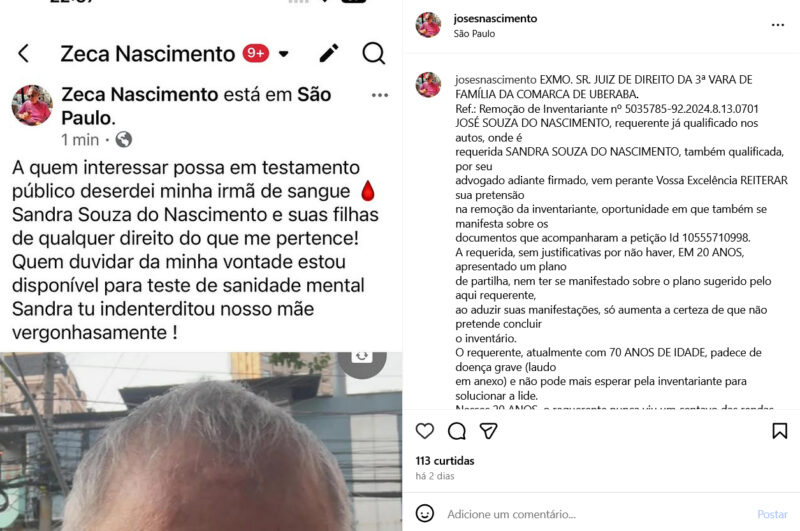O empresário Zeca Nascimento, de Manaus, tornou pública uma disputa judicial familiar ao divulgar, em suas redes sociais, na última sexta-feira (7), um pedido de remoção de inventariante protocolado na 3ª Vara de Família da Comarca de Uberaba (MG). O documento tem como alvo sua irmã, Sandra Souza do Nascimento, a quem ele acusa de reter a conclusão do inventário da família há 20 anos.