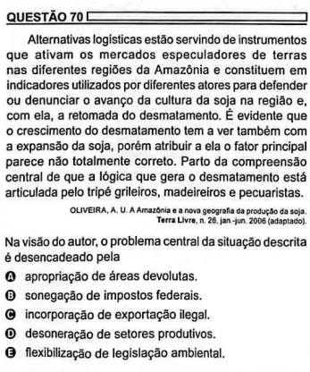 Os parlamentares pedem a anulação das questões 70, 71 e 89, que tratam de temas relacionados a desmatamento, populações indígenas e agronegócio.