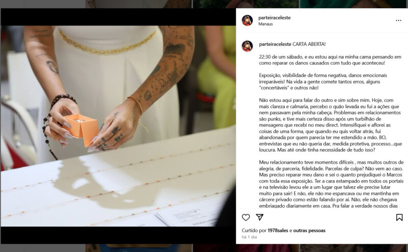 A enfermeira obstétrica Isabela Persilva, de 42 anos, conhecida nas redes sociais pelo perfil profissional “@parteiraceleste”, voltou a se manifestar publicamente na noite do último sábado (17), após quase duas semanas de ter denunciado nas redes sociais e na polícia o ex-companheiro, o jornalista Marcos Sérgio, de 51 anos, por violência doméstica. Em uma carta aberta publicada no Instagram por volta das 22h30, a profissional expressou arrependimento pela repercussão e exposição do caso, e questionou a proporção que os fatos tomaram desde então.