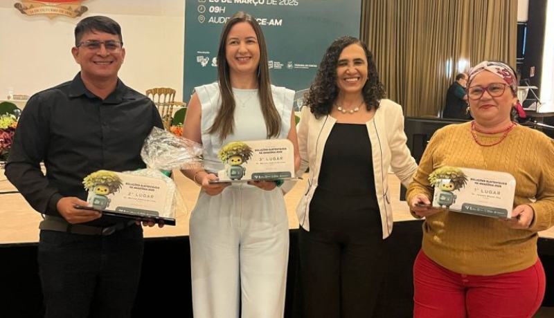 O primeiro lugar do concurso ficou com o projeto “Arborização e práticas de Educação Ambiental”, da EE Geny Bentes de Jesus, coordenado pela professora Patrícia Rosaneide Nunes Pereira, com participação das estudantes Bianca Yasmin Machado, Kamylla Alves Fragata, Letícia de Souza Gomes, Vitória Raulin Monteiro e Vivian Reis da Costa, alunas do 7°, 8° e 9° ano.