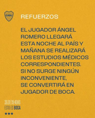 No começo de janeiro, o clube brasileiro se despediu do atleta após três temporadas. Romero estava livre no mercado. Ele chegou em Buenos Aires nesta segunda-feira (27). Nesta terça, Romero fará exames médicos e, se liberado, o anúncio oficial como novo jogador do Boca deve acontecer ainda ao longo do dia.
