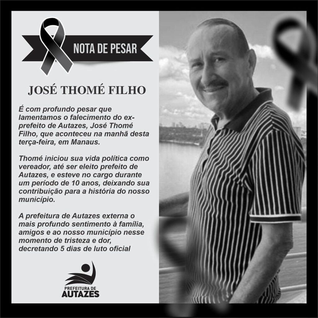 “Quero me solidarizar com os amigos e familiares do ex-prefeito Thomé Filho, que dedicou sua vida à política e população do Amazonas. Desejo que recebam o consolo necessário nessa hora e mantenham viva a certeza de que um dia, na ressurreição, todos se encontrarão”, declarou o prefeito.