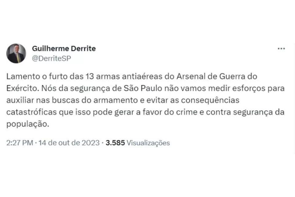 Conforme revelou o Metrópoles, 13 metralhadoras calibre ponto 50, capazes de derrubar aeronaves, e 8 de calibre 7,62 foram furtadas por criminosos ainda não identificados na quarta-feira (11/10).