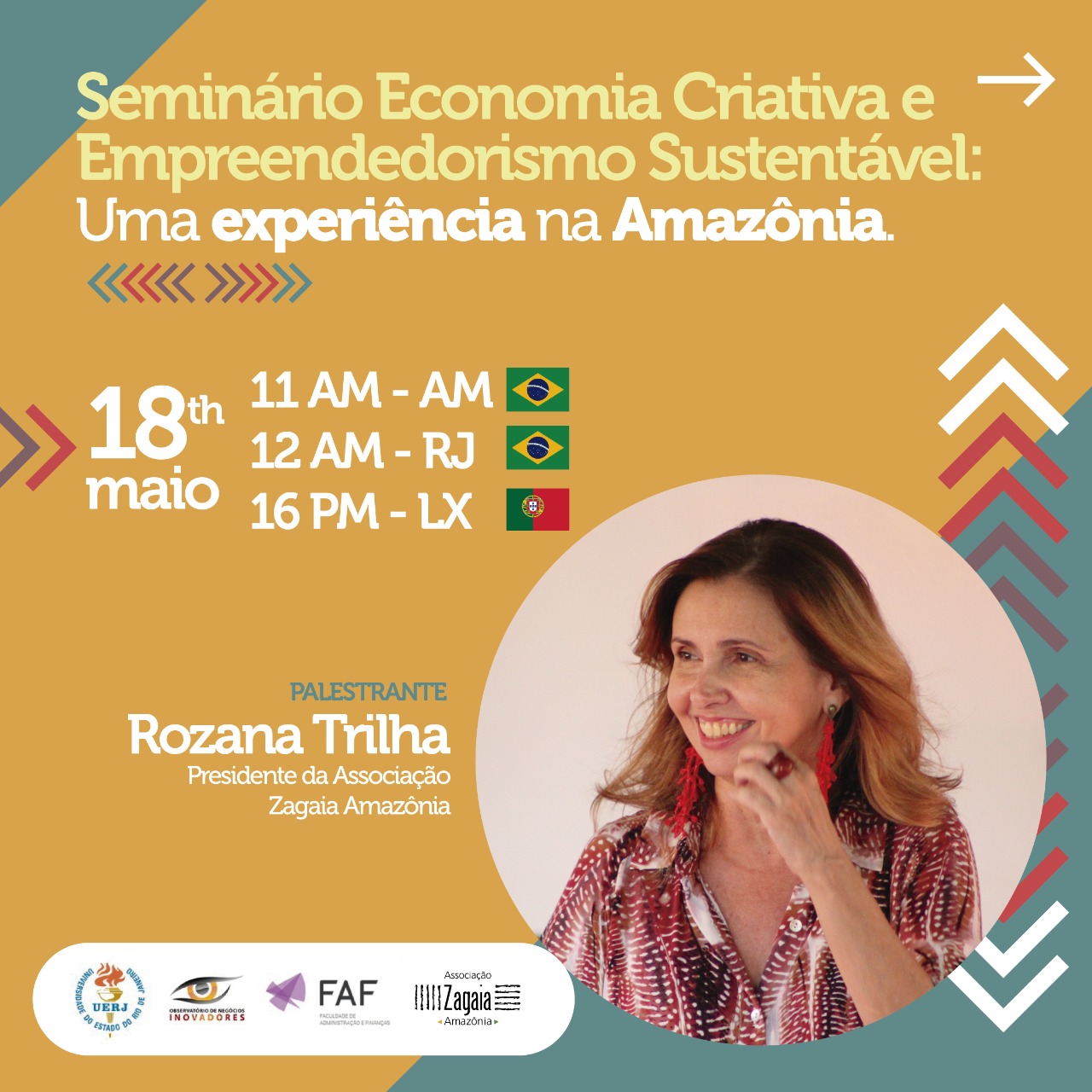 A experiência positiva resultado de diversos casos de sucesso da Associação Zagaia Amazônia será tema de palestra da presidente da Associação, Rozana Trilha, no evento on-line “Seminário de Economia Criativa e Empreendedorismo Sustentável: uma experiência na Amazônia” que acontece, na próxima quarta-feira, dia 18, às 11h, hora Manaus, com transmissão via Canal do Observatório de Negócios Inovadores (ONI), no YouTube. O Seminário é promovido pelo ONI e pela Faculdade de Administração e Finanças, ambos da Universidade do Estado do Rio de Janeiro (UERJ) e pela Universidade de Aveiro, em Portugal.