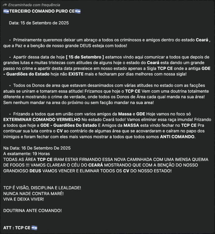 Um comunicado oficial divulgado por criminosos do Terceiro Comando Puro do Ceará (TCP-CE), na última segunda-feira (15/9), anuncia o início de um embate violento que pode transformar a guerra entre criminosos ainda mais sangrenta no estado nordestino.