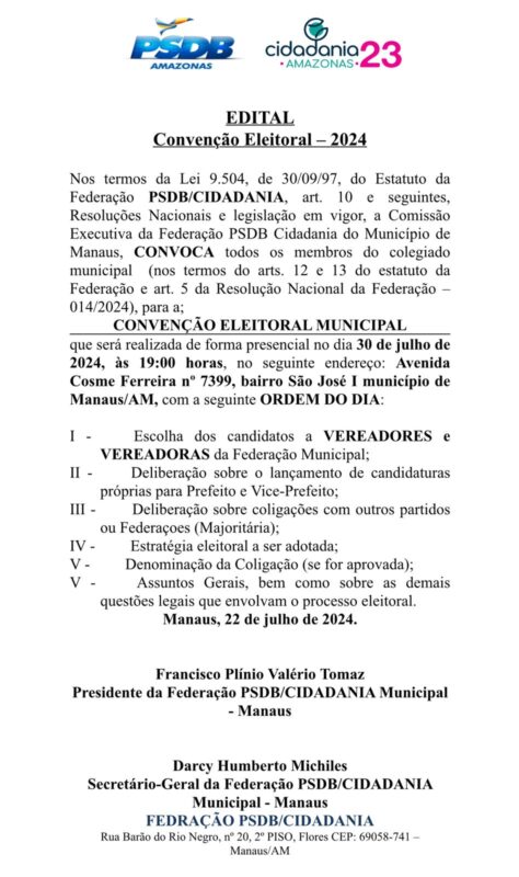 Na noite desta segunda-feira, dia 22 de julho, a federação PSDB-Cidadania divulgou o edital para a sua convenção partidária. O evento, que acontecerá na próxima terça-feira, dia 30 de julho, no Clube do Trabalhador do Amazonas – SESI, localizado na Zona Leste de Manaus.
