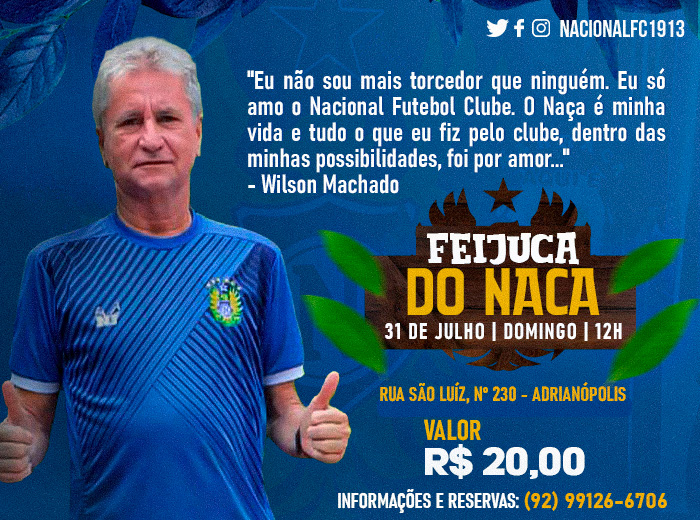 O Nacional Futebol Clube promoverá na tarde deste domingo (31), no Parque Aquático da sede, a feijoada beneficente em prol do nacionalino, Wilson Machado, que enfrenta sérios problemas de saúde. Para o torcedor, o apoio do clube é essencial e muito bem-vindo, pois, devido as oito hérnias de disco, uma delas pressiona o nervo ciático, atualmente está sem condições de trabalhar e conta com o auxílio de amigos e familiares.