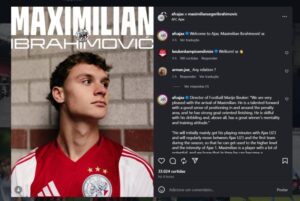 Maximilian Ibrahimovic, filho de Zlatan, foi emprestado pelo Milan ao time holandês até o fim da temporada. O Ajax ainda terá uma opção de compra do atleta de 19 anos.
