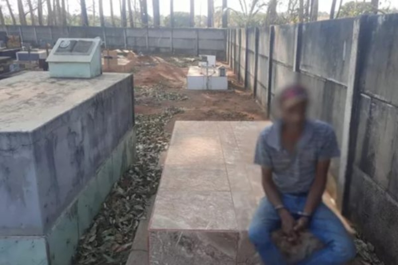 O homem, que não teve a identidade divulgada pela polícia, aparece em uma foto sentado em cima de um túmulo, no momento em que foi preso, segundo a PM.