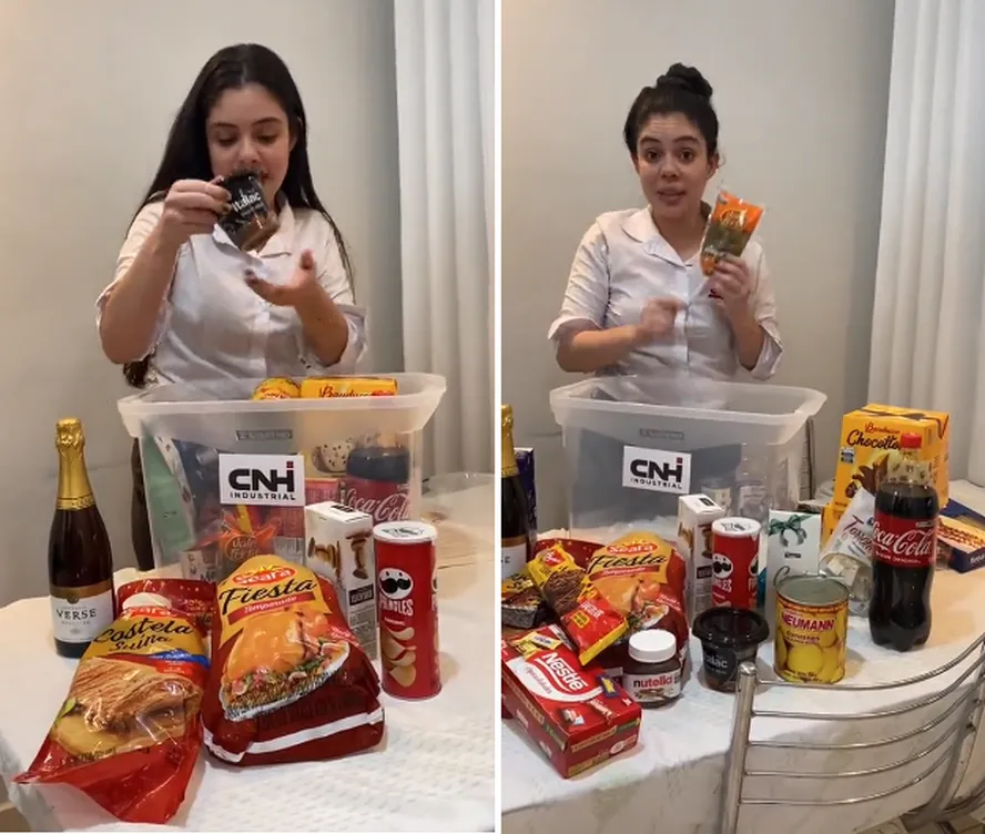 Uma funcionária de empresa multinacional Italiana viralizou, nesta quinta-feira, nas redes sociais ao mostrar os itens que vinham na cesta de fim de ano que ela ganhou da empresa na qual trabalha. Nas imagens, a jovem abre uma bolsa térmica e uma caixa organizadora, com itens como chester, panetone, champagne, refrigerante, chocolate e batata frita.