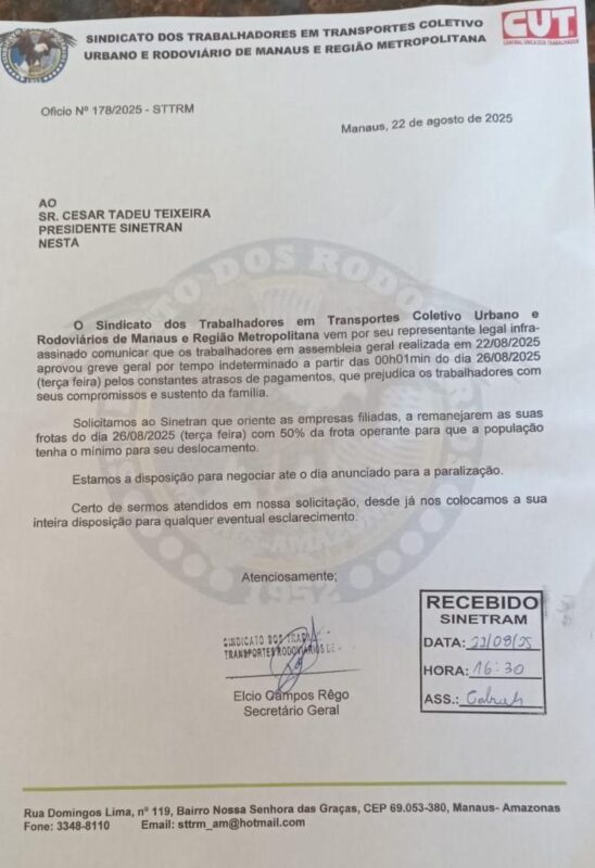 O Sindicato dos Trabalhadores em Transportes Coletivo Urbano e Rodoviário de Manaus e Região Metropolitana (STTRM) confirmou, neste sábado (23), que a categoria entrará em greve geral a partir da próxima terça-feira (26), em razão dos constantes atrasos no pagamento dos salários. A decisão foi aprovada em assembleia realizada no dia 22 de agosto e prevê paralisação por tempo indeterminado.