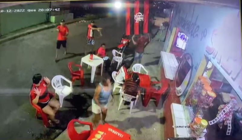 O crime foi registrado por uma câmera de segurança, que mostra o momento em que os indivíduos, se aproximam do estabelecimento, abordam as pessoas que estavam sentadas assistindo a partida de futebol e obrigam as vítimas a entregar os pertences.