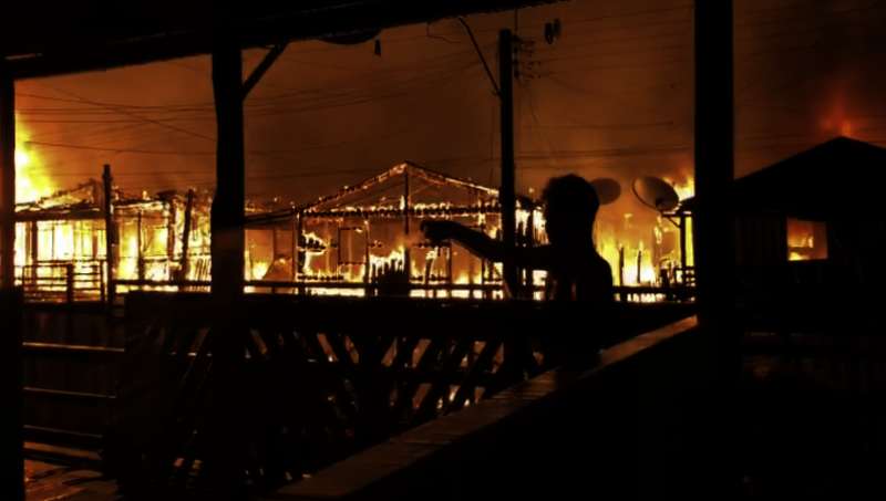 Imagens compartilhadas na internet mostram o fogo tomando conta das casas de madeira e moradores tentando apagar as chamas.