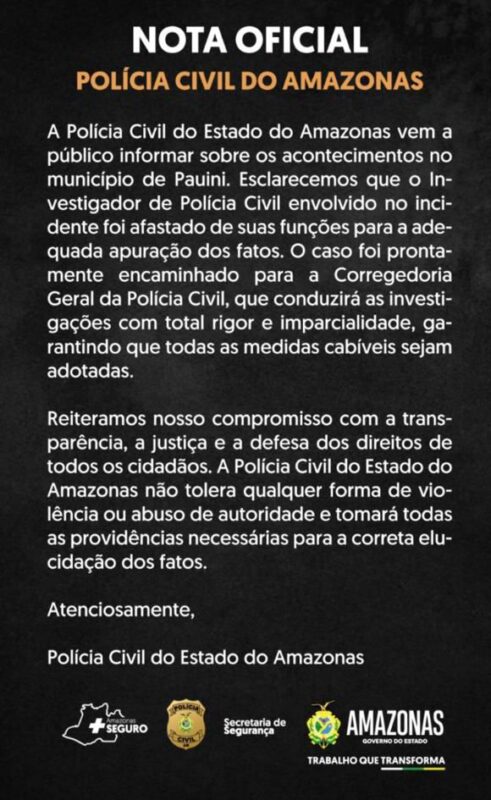 Em nota, a Polícia Civil informou que o investigador Alisson foi afastado de suas funções até a conclusão das investigações. O caso foi encaminhado à Corregedoria Geral da Polícia Civil, que conduzirá a apuração com rigor e imparcialidade.