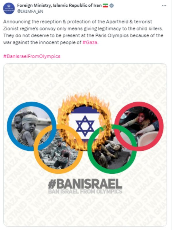 O comunicado oficial iraniano foi divulgado no X (antigo Twitter) e afirma que a delegação israelense “não merece estar presente nos Jogos Olímpicos de Paris por conta da guerra contra o povo inocente de Gaza”.