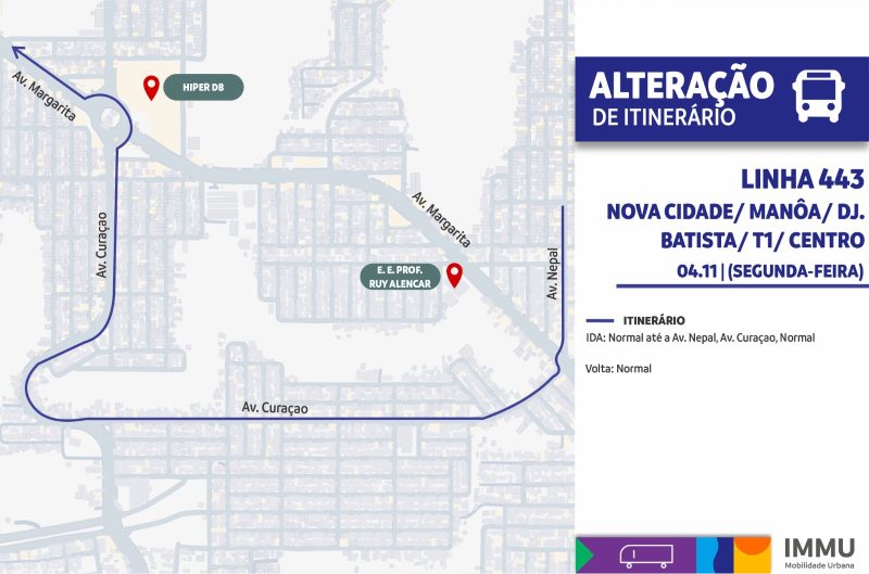 A Prefeitura de Manaus, por meio do Instituto Municipal de Mobilidade Urbana (IMMU), informa que, a partir da próxima segunda-feira, 4/11, a linha 443 (Nova Cidade/ E4-E3/ Djalma Batista/ Terminal 1/ Centro), deixará de atender o trecho da avenida Margarita, entre a avenida Nepal e a avenida Curaçao. A mudança é necessária para atender a nova sinalização semafórica instalada na avenida Margarita, que facilitou o acesso direto da avenida Nepal em direção à Curaçao.
