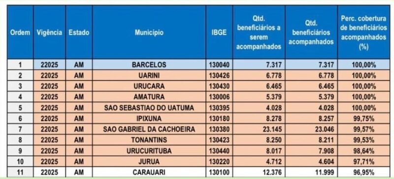 O município de Juruá alcançou um dos melhores desempenhos do estado no monitoramento das condicionalidades de saúde do Programa Bolsa Família. Na segunda vigência de 2025, a cidade atingiu 97,71% de cobertura, passando a figurar entre os dez municípios mais bem avaliados do Amazonas nesse indicador.