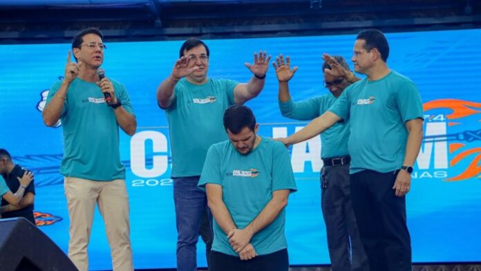 Renato Júnior recebe orações e bênçãos durante o CONJADEM, em Manaus, em momento conduzido pelo vereador e pastor Eduardo Alfaia, após anúncio de que assumirá a Prefeitura no dia 30 de março.