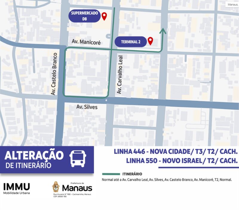 A linha 550 e 446 terão seus itinerários alterados, passando a atender o seguinte percurso: normal até avenida Carvalho Leal, depois passarão pelas avenidas Silves, Castelo Branco, Manicoré e, depois, segue o itinerário normal. Os usuários do percurso suprimido das referidas linhas (avenidas Leonardo Malcher, Visconde de Porto Alegre e 7 de Setembro) terão como opções no Terminal da Cachoeirinha (T2) as linhas 677, 680 e 715. Essa medida visa dar mais velocidade na operação da linha e retorno mais rápido ao bairro.