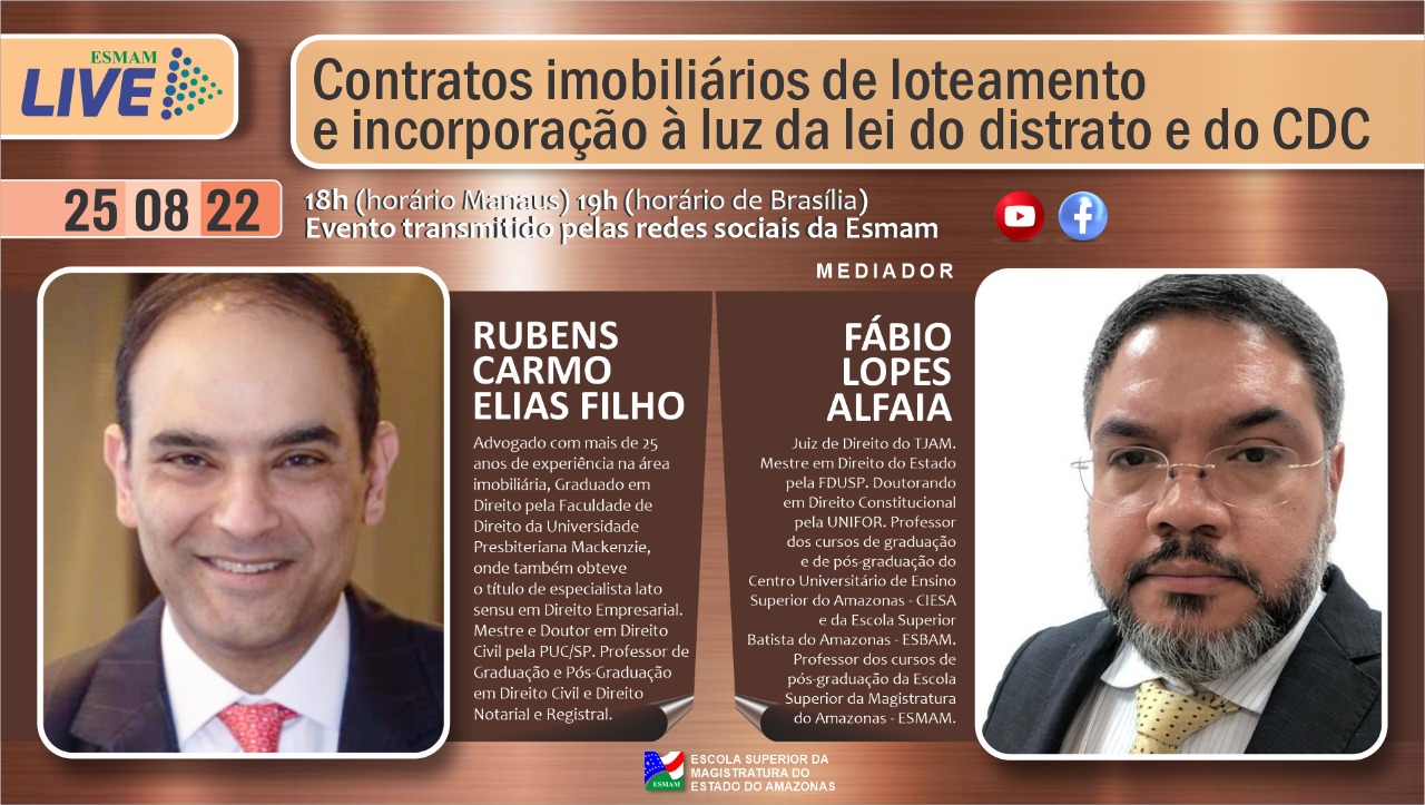 No dia 25 deste mês de agosto (próxima quinta-feira), às 18h (horário de Manaus, 19h em Brasília), a Escola Superior da Magistratura do Amazonas (Esmam) promoverá nova edição do projeto “Live Esmam”, desta vez com o tema “Contratos imobiliários de loteamento e incorporação à luz da lei do distrato e do CDC”. O evento será transmitido pelas redes sociais da Escola e no canal da Esmam no YouTube (https://youtube.com/user/esmamam).