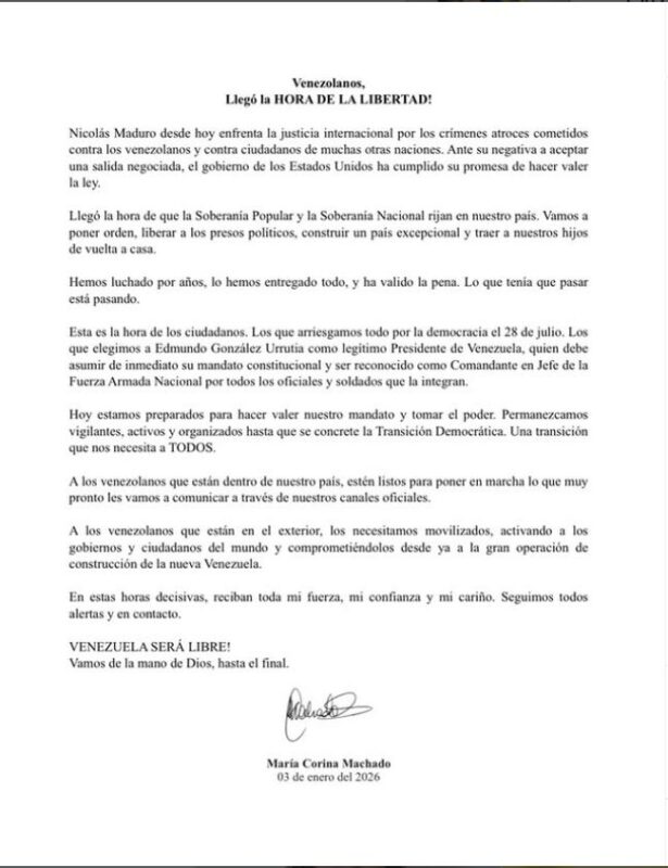 Na mensagem, María Corina afirma que, após a recusa de Maduro em aceitar uma saída negociada, os Estados Unidos teriam cumprido a promessa de “fazer valer a lei”. Para a opositora, o momento marca o início de uma nova fase em que a soberania popular e a soberania nacional devem prevalecer, com a restauração da ordem democrática e a libertação de presos políticos.