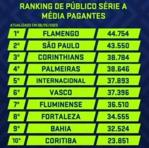 O Flamengo lidera o ranking, com 44,7 mil, seguido por São Paulo (43,5 mil), que tomou o segundo lugar do Corinthians, agora em terceiro na lista (38.7 mil). Os nordestinos Fortaleza e Bahia também estão bem nessa lista, com públicos médios acima da marca de 30 mil.