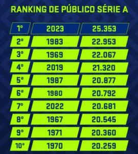 O levantamento foi feito pelo site @rankingcbf.com que contabiliza detalhes importantes. Este ano, além de liderar a média histórica, o campeonato conta com nove times com médias acima dos 30 mil pagantes, até o fim da 4ª rodada, um feito difícil de ser repetido.