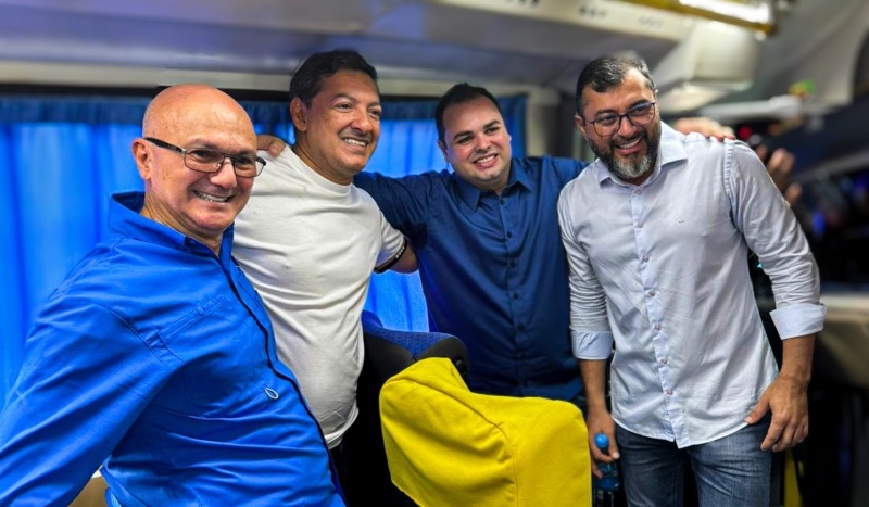 Fotos circulando antes do evento mostravam Menezes, o deputado Felipe Souza, Roberto Cidade e o governador Wilson Lima dentro de um ônibus que os levou à quadra da Aparecida.