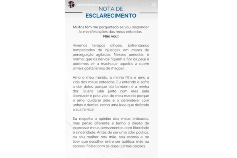 Na nota, Michelle diz respeitar o posicionamento dos enteados, mas afirma ter o direito de expressar os pensamentos com liberdade e sinceridade. “Eu tenho o direito de não aceitar isso, ainda que essa fosse a vontade do Jair (ele não me falou se é)”, explica.
