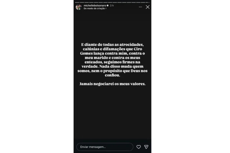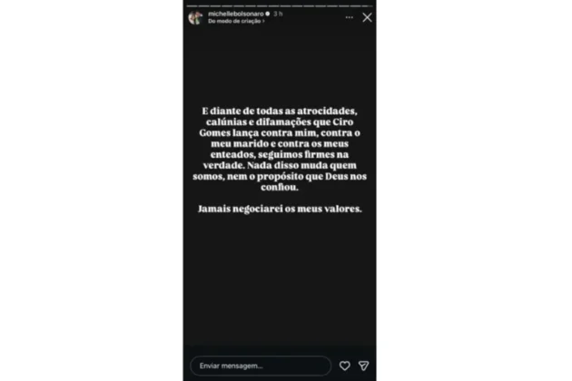 Michelle Bolsonaro publicou uma nota nas redes sociais, nesta terça-feira (2/12), sobre as críticas que recebeu dos enteados, os filhos do ex-presidente Jair Bolsonaro. A ex-primeira-dama foi alvo de ataques após condenar a aproximação do diretório do Partido Liberal (PL) no Ceará com Ciro Gomes (PSDB), durante um evento partidário em Fortaleza (CE), nesse domingo (30/11).