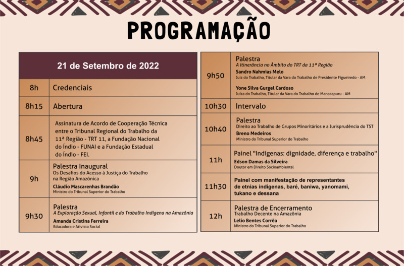 Na abertura do evento haverá a assinatura de um Acordo de Cooperação Técnica entre o TRT 11, a Fundação Nacional do Índio (FUNAI) e a Fundação Estadual do Índio (FEI), cujo objetivo é a cooperação técnica-científica, administrativa e operacional entre os as instituições, visando à adoção de políticas e ações de proteção contra a exploração do trabalho infantil, da mulher e do indígena no Estado do Amazonas. O acordo visa também a atender às demandas e necessidades específicas de melhoria do acesso à justiça do trabalho da população indígena.