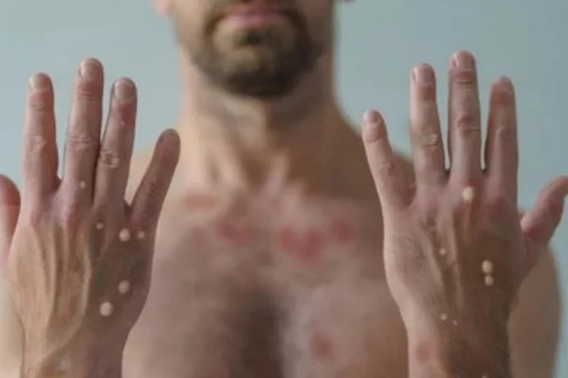 Além do contato pele a pele, a doença pode ser transmitida a partir de gotículas respiratórias e, possivelmente, por aerossóis de curto alcance caso haja lesões ou feridas infecciosas na boca.