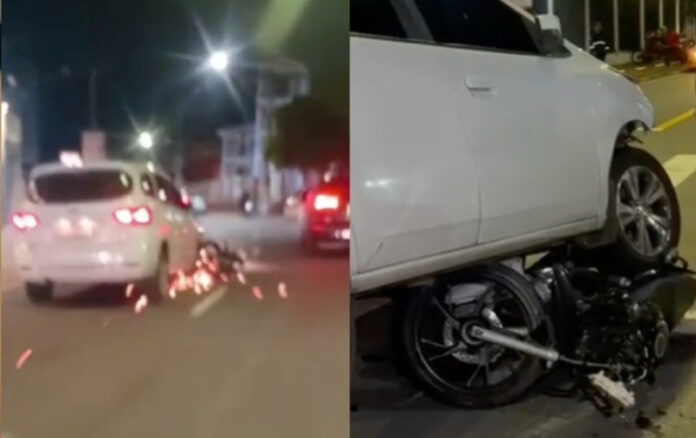 Um acidente inusitado e de grande repercussão foi registrado na noite desta terça-feira (27), no bairro Parque 10, Zona Centro-Sul de Manaus. Uma mulher, cuja identidade não foi divulgada, foi detida após colidir com um motociclista e continuar dirigindo por cerca de três quilômetros com a moto presa à parte dianteira do carro.