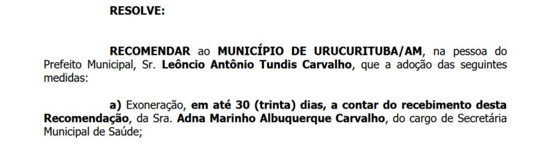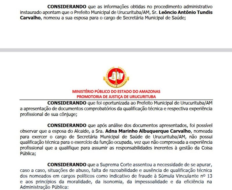 O Ministério Público do Estado do Amazonas (MP-AM), por meio da Promotoria de Justiça de Urucurituba, expediu a Recomendação nº 09/2025 ao prefeito Leoncio Tundis Carvalho, exigindo a exoneração da secretária municipal de Saúde, Adna Marinho Albuquerque Carvalho, que também é esposa do gestor. Segundo o órgão, a nomeação configura prática de nepotismo e descumpre princípios da moralidade e eficiência administrativa, já que a secretária não possui comprovação de qualificação técnica ou experiência para ocupar o cargo.
