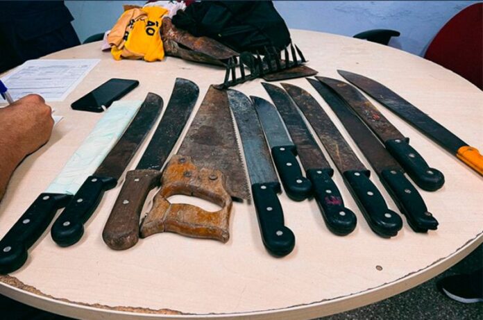 Durante a ocorrência, as equipes policiais se depararam com focos de incêndio na área verde, o que configurou o flagrante das ações criminosas ambientais. Com os detidos, foram apreendidos 10 terçados e um serrote, usados para o desmatamento ilegal.