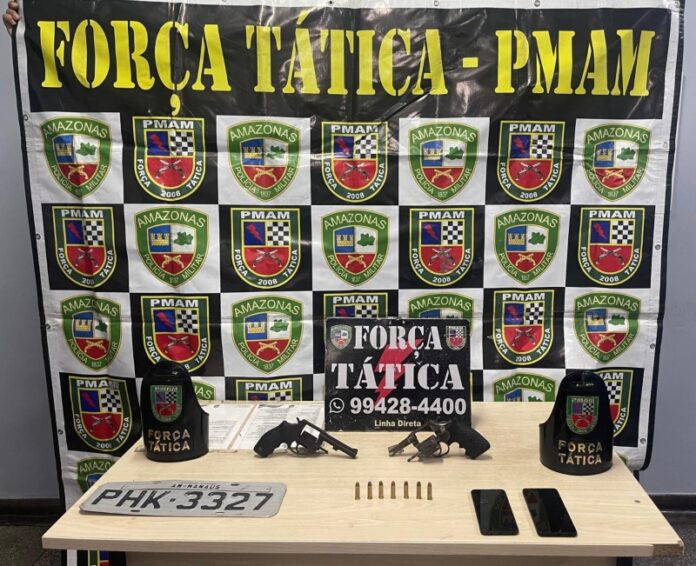 Policiais militares da Força Tática prenderam três homens, com idades entre 22 e 42 anos, pelo crime de porte ilegal de arma de fogo e roubo, no bairro Cidade Nova, zona norte da capital. E foram apreendidos um celular Samsung azul, um celular Samsung preto, dois revólveres, calibre 38, marca Taurus, com sete munições. O veículo roubado também foi apreendido, um Chevrolet/Onix, 1.0MT, placa PHK- 3327. Os homens foram encaminhados para o 6° Distrito Integrado de Polícia (DIP).